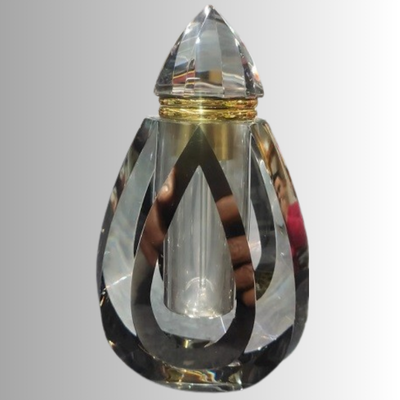 This elegant attar bottle showcases a teardrop silhouette with bold, flame-like black detailing embedded in clear crystal. Finished with a faceted pointed cap and gold accent, it reflects sophistication—ideal for presenting your finest, handcrafted fragrances.